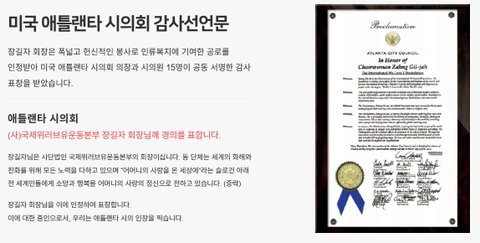 국제위러브유운동본부 장길자회장님의 미국 애틀랜타 시의회 감사표창