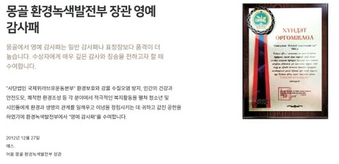 국제위러브유운동본부 장길자회장님의 몽골 환경 녹색발전부 장관 영예 감사패 수상