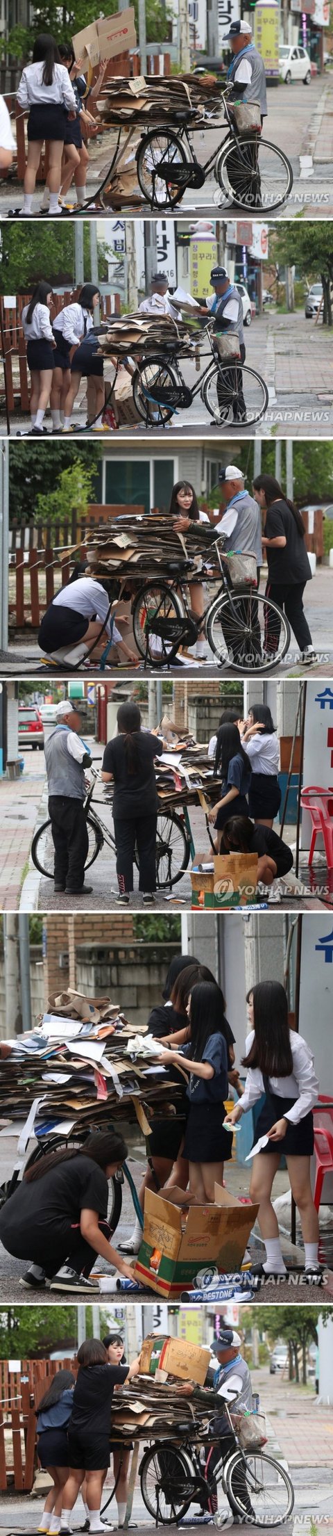 폐지 수거 노인 돕는 여학생들