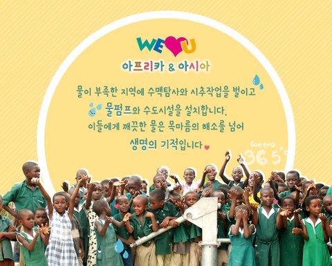 우리 삶에 있어 가장 밀접한 관련이 있고 가장 필요한 물,그러나 아시아, 아프리카 물부족국가 식구들에게는가장 절실히 필요로 한 것이 바로 생명을 유지할 수 있는 식수입니다