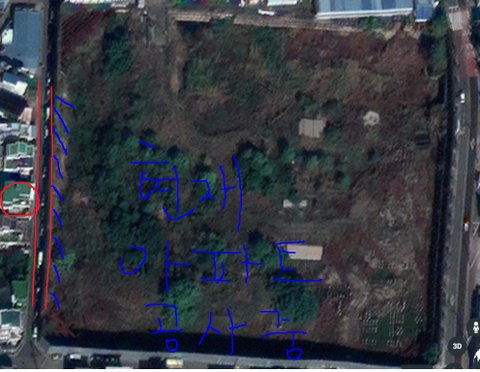 위 사진은 구글어스에서 본 우리집 주변 위성사진인데요. 편집을 하지 않은 사진도 필요할거 같아서 두장 넣었습니다. 제가 빨간색으로 동그랗게 표시한게 우리집이고 집앞에 그은 빨간 선 두개가 집앞 도로에요. 도로를 기준으로 집 반대편에는 5m정도 높이의 절벽(파란색 빗금친 부분)이 있고 절벽을 지나서는 다시 수풀이 우거진 평지가 있는 상태입니다.