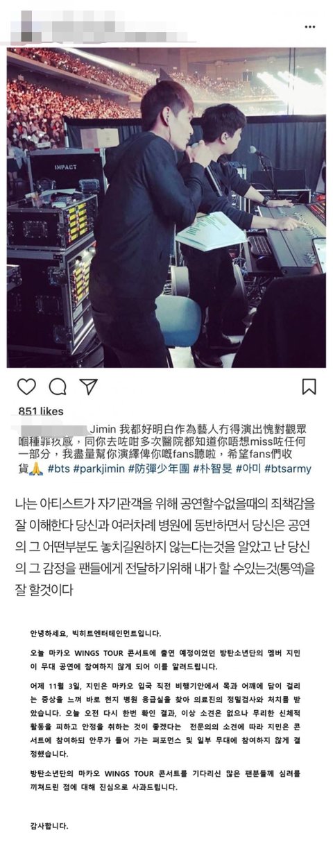 2017년 11월 마카오 콘서트 당시 지민의 몸 상태가 별로 좋지 못했는데 그 콘서트에서 통역을 맡아주신 분이 개인 SNS에 올리신 글
