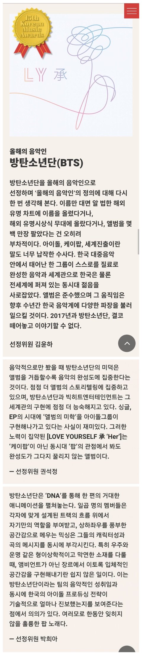 2018 한국대중음악상 올해의 음악인으로 선정된 방탄소년단에 대한 전문가들의 코멘트