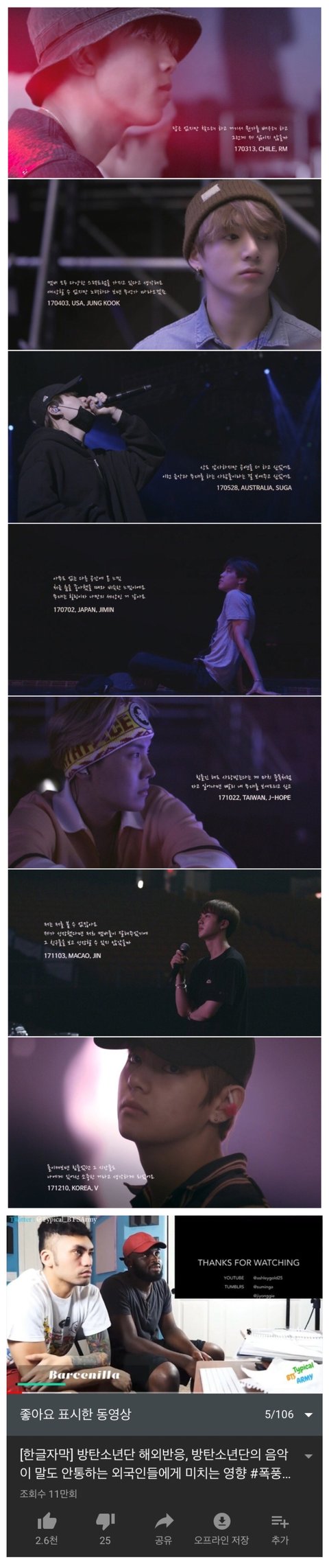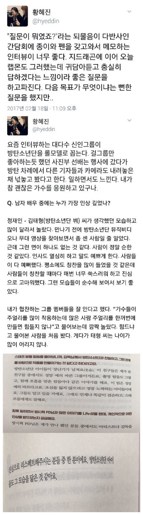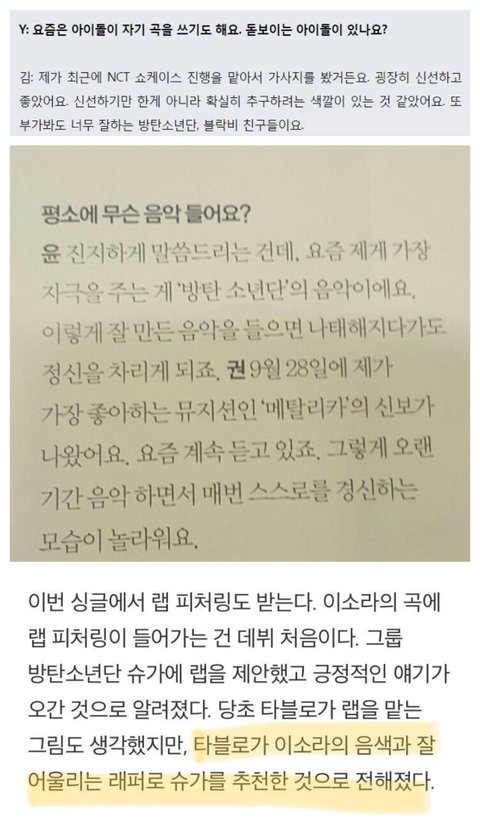 위에서부터 작사가 김이나, 십센치, 타블로의 방탄소년단 언급