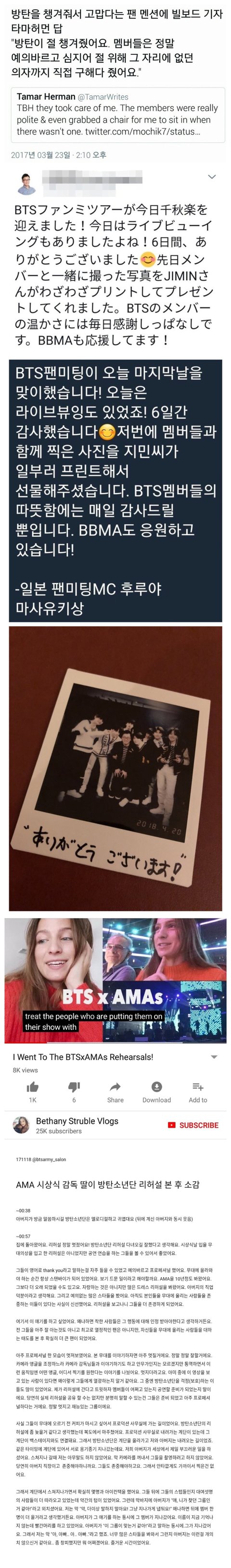 위에서부터 빌보드 기자 타마허먼, 일본 팬미팅 MC를 맡았던 후루야 마사유키, AMA 시상식 감독 딸이 말하는 방탄소년단