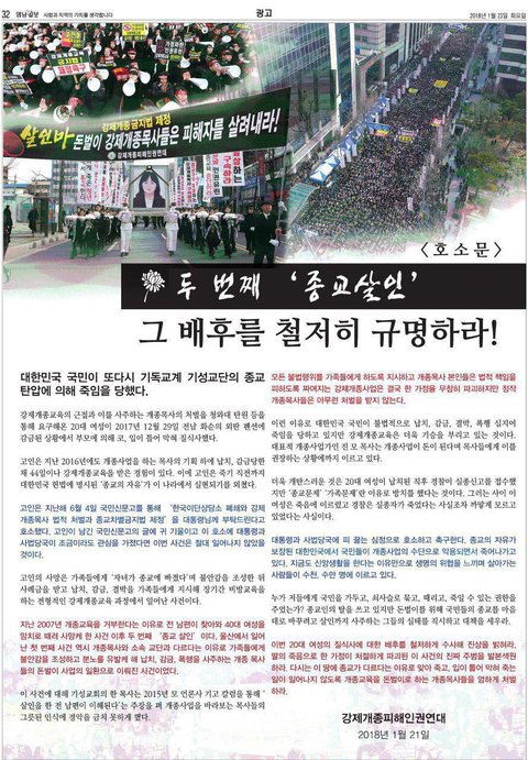 대한민국에서 불법 강제개종은 근절되어야 합니다. 다시는 이런일이 일어나지 않기를 호소하는 바입니다!!