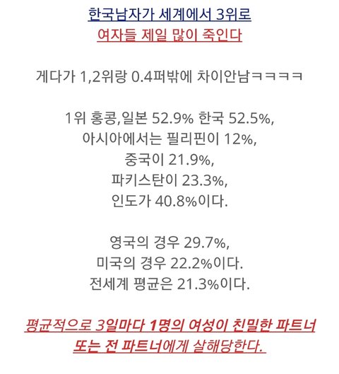한국이 세계에서 3위로 여자들 제일 많이 죽인다
