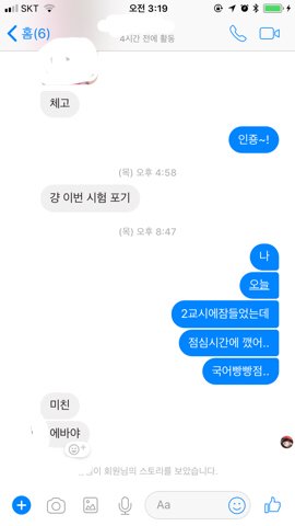 아글고 따아니냐는 소리도 있는데 따아니얔ㅋㅋㅋㅋㅋㅋ친구 많아..ㅋㅋㅋㅋㅋㅋㅋㅋㅋㅋㅋㅋㅋㅋ근데 그 애들이 시험시간에 왜 안깨워준건진 참 의문이영