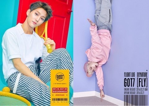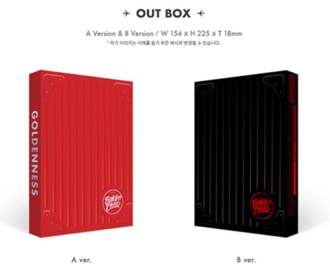 (좌) 갓세븐의 2016년 정규앨범 [flight log : turbulence], (우) 골든차일드 2018년 싱글앨범 [Goldenness] 앨범 겉 케이스 비교. 둘 다 하드한 재질의 캐리어를 연상케하는 디자인이다.