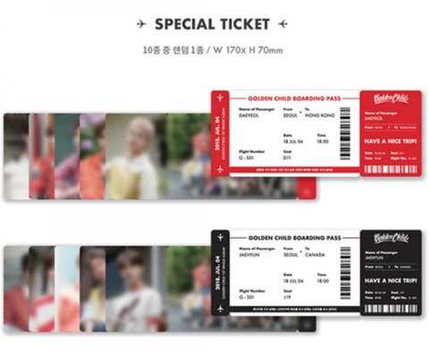 (위) 골든차일드의 [Goldenness]에 포함된 비행 티켓을 연상시키는 포토티켓. 위 갓세븐의 사진과 매우 유사하다.