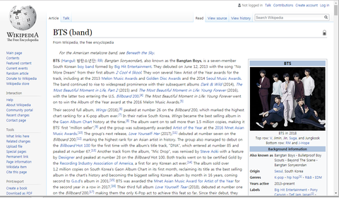 이뽀 : ) 윜히디피아 꾸준히 해주기 소셜챁위해서 ! 온리 데스크탑 ! https://en.wikipedia.org/wiki/BTS_(band)