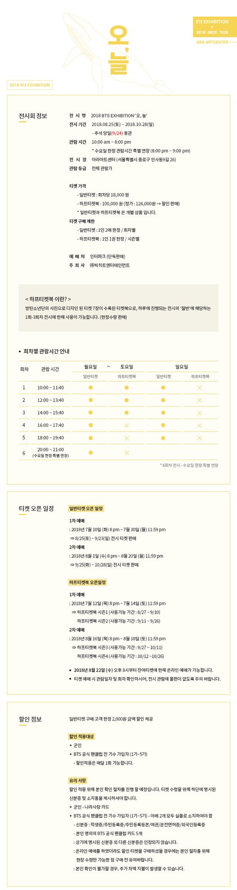 내가 정리해줄게. 티켓은 일반티켓과 하프티켓북 두가지로 나뉘는데 일반티켓은 단 1회차 전시회 1시간 40분동안 관람이 가능하고 회차 시간이 끝나면 퇴장해야됨. 하프티켓북은 7명 이미지가 담긴 7장 티켓이 들어있는데 회차시간 지나면 더이상 못보는 일반 티켓과 달리 한번에 3회차까지 관람할수 있어. 시간으로 치면 1시간40분x3회차분 인거지. 이 하프티켓북은 총 4시즌 판매되고 시즌1 기간이 8월27일~9월10일이니까 그 사이 티켓 7장으로 총 7일간 이용가능한거. 단, 일요일은 관람객 폭주로 하프티켓북 이용불가