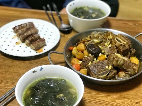 열심히 미역국을 끓이고 소고기 팽이버섯말이를 하고