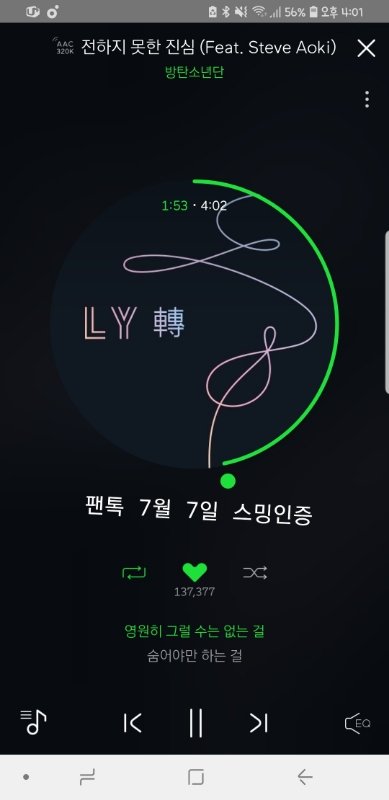 남준이가 부른 랩 파트 부분이 정말 정말 슬펐어. 태형이가 웨일리언 52 부르면서 눈물 흘렸던 콘서트였나 거기서 남준이가 정말 슬픈 노래를 만들고자 했고, 그래서 만들어진 게 이 노래라고 했었는데 그 말을 생각하면서 들으면 더 슬프더라구. 자신들이 들려주고자 하는 이야기를 만드는 게 꿈이었고, 그래서 시작한 가수라는 직업이 현실과 부딪히며 좌절되었을 때의 느낌이 너무 잘 묻어져 나오는 느낌이라서.. 다른 헤르츠를 가지고 있어 외로운 고래와 이 노래 당시의 탄이들의 상황이 너무 잘 맞닿아 있다고 생각해서 찡했던 부분이야.