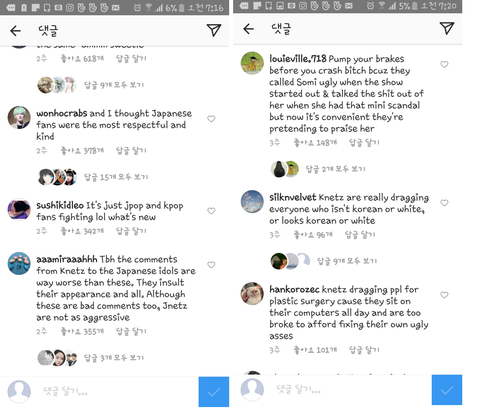 하여간 원한류나 올케이팝(이름은 이따구로 지어놓고 왜 일본이랑 중국은 껴넣는지 아직도 이해가 안감 인기도 없는데)에서도 일본 네티즌 반응을 간간이 퍼오는데 일부러 그러는지 모르겠지만 절대 인종차별이나 악플들은 번역 안한다는거야  그래서 한번은 kpop관련 반응중에 악플이 좀 있을때마다 위에서 보다시피 "어머 착한 일본인들이 그럴리가~"라는 반응들ㄷㄷ아마 일본인들이 우리를 부르는 멸칭은 알지도 못할걸 번역을 안하니까