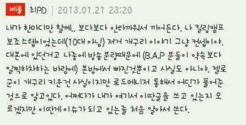 2. 킬링캠프 보조스텝이었다고 했는데 아이디는 최PD임. 그냥 스텝도 아니고 보조스텝임. 정규직도 아니었을텐데 3개월만에 피디가 되서 네이트판에 구세주처럼 나타나 최PD라는 닉넴으로 비에이피 개구리사건에 대한 해명글을 쓴다? 말도 안되는 일임..