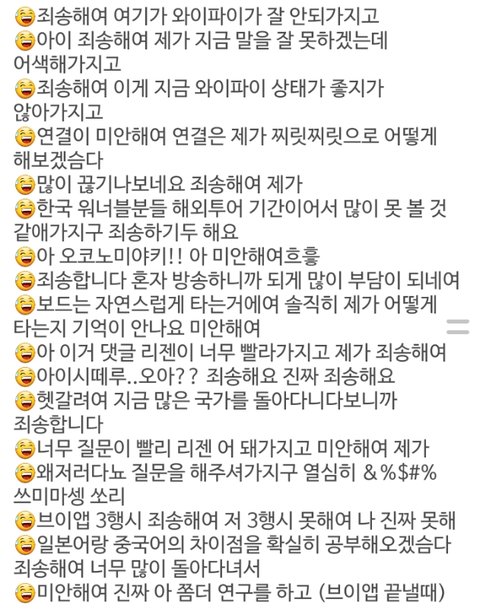 어제 브이앱 미안해요 모은거래 머가 미안해 미안해하지않아도 괜챠나 8ㅅ8 소통하려고 하는거 너무 고맙고 사랑스러웠다구ㅠㅠㅠㅠㅠㅠㅠㅠㅠ