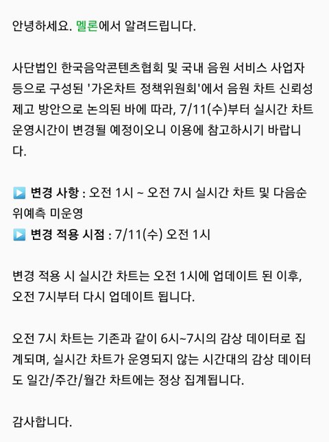 이전에 한번 바뀌었던 오전에 음원 내면 오후1시부터 차트에 반영되는거? 이거도 이번에 바뀌는거랑 비슷한 취지로 이루어졌던 것 같은데 ㅋㅋㅋㅋㅋ 의미도 없고 감동도 없고...