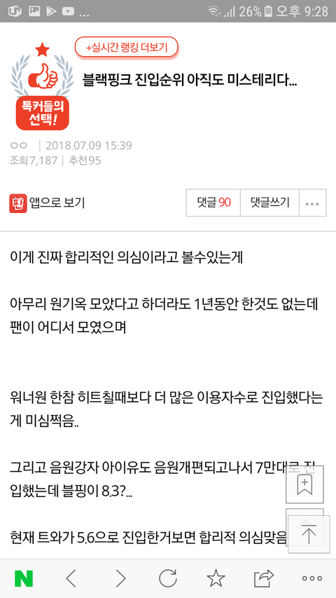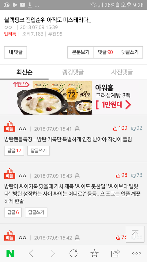 난 인증가능타팬이고 톡선도 그렇고 신경안쓰면되지 팬코에 평소 방탄에 악감정있는 사람이 아미,블링크 이간질할려는거보고 답답해서 쓴다..정작 두팬덤은 가만히있는데 옆에서 어떻게든 뭐일내려고 글쓰는지 모르겠다.. 톡선보는데 진짜 소름돋았어;;방탄까내리려고 팬코한다음에 글바꾸고 일부로 욕먹일려고 진짜.. 타팬이봐도 이런데 아미들 많이 속상하겠다 나2015년판때도 있었는데 그때 방탄까글로 도배였고 지금잘나가는거 보면 내가다 속시원해 블랙핑크도 슈퍼컴퓨터 조작어쩌구 있었는데 신인성적잘되는꼴못보는지 참.. 잘나가면 까려고하는게 판특성인가?