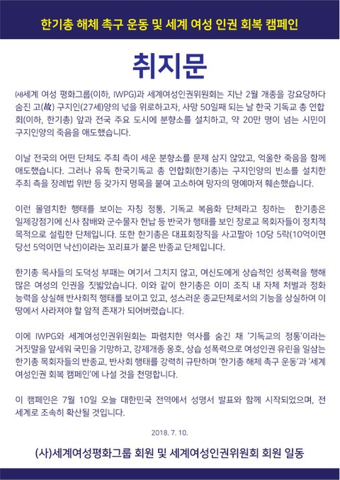 ‘한기총 여성인권 유린 및 묵살 만행 강력 대응’ 이라는
