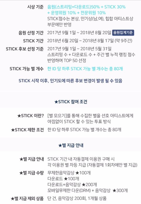 - 시상 기준 : 음원(스트리밍,다운로드 50%)+투표30%+운영위원10%+전문위원10%