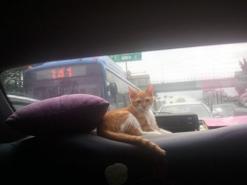 꺼내주니 저리 차 뒷좌석 위에 올라가서 세상 구경함 ㅋㅋ
