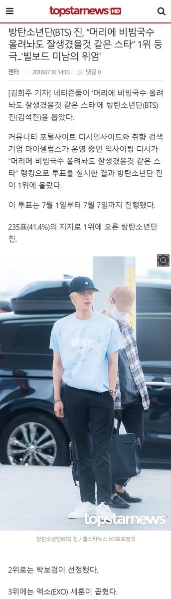 방탄소년단 진, “머리에 비빔국수 올려놔도 잘생겼을것 같은 스타” 1위 등극