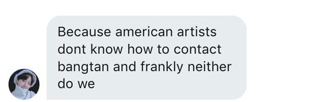 “미국 아티스트들은 방탄을 어떻게 컨택하는지 모르고 (방탄은 미국아티스트가 아니라 한국아티스트라 조금 더 복잡할 수 있다고 함) 아미들도 방탄을 컨택하는 방법을 몰라서(빅히트는 계속 잠수타니까)”라고 함