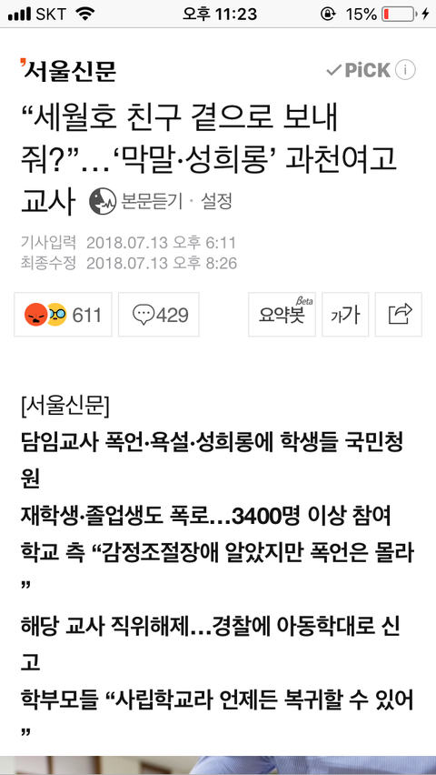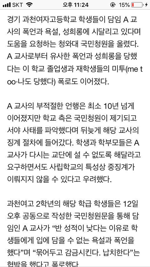 우리학교는 생각보다 많은 선생이 선생이라는 자격가지고 자질도없으면서 칠판앞에서 떠들어대고 사건터지면 돈으로 입막음하고다닙니다 아무리 사립이라도 십몇년동안 선생님이 안바뀌는게 말이 안돼요 오죽하면 직장인 다되서 자리잡으신 졸업생분들이 아직도계셔?! 이런소리를 다하시나요 교원평가라고 선생님들 평가하는거 항상 저희들은 소리쳤는데 반영도 안하는 평가를 왜하는건지 너무 답답할 뿐입니다 위에서 짜고치는거 우리학생들도 다아는 사실인데 힘이없어서 그동안 말해도 다들 모르쇠 눈감고 넘겨버립니다 제발 이번 일을 통해 저희학교 선생님들 뿐만아니라 선생이라 할수없는 사람들 자격을 뺏고 모든 비리를 찾아내 처벌받았으면 좋겠습니다