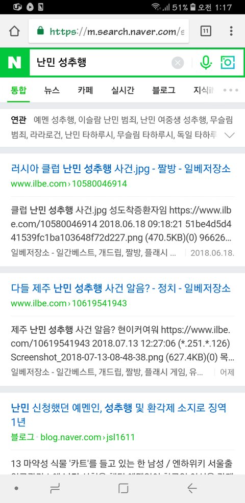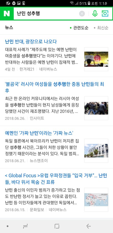 그리고 12일 기사 뜬 예멘인이 클럽에서 마약먹고 4명 성추행했는데 예멘에선 마약이 합법이라며 감형된 사건 있잖아 이 정도면 기사로 도배가 되어야 정상 아님? 근데 난민 성추행이라고 치면