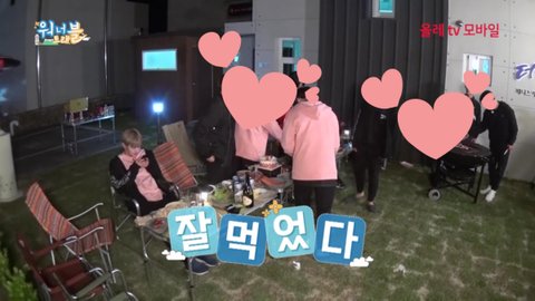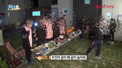 제주도 팬션에서 고기구워먹는 장면인데 두명의 멤버가 9명을 위해 열심히 고기를 굽고있어 워너원이 너무 착한게 2명이 고기굽느라 못먹으니 고맙다며 한명은 라면을 끓여다주고 나머지도 바통터치하면서 구워줬는데 그중 리더가 한행동좀봐줘