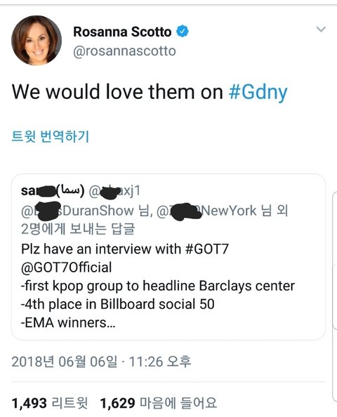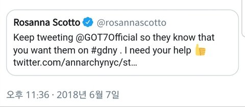 약 한달여전 폭스티비 인기프로인 굿데이뉴욕 엠씨분인 로산나 스캇씨가 이런 트윗을 받습니다. 바클레이센타 최초 공연 케이팝가수 갓세븐을 굿데이뉴욕에 출연시켜달라구요.
