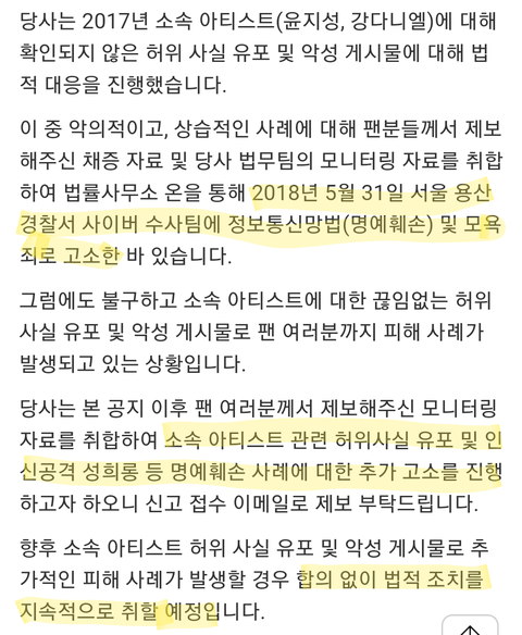 판은 댓글 다는애들이 거기서 거기야. 그니까 판댓글이랑 까글을 피뎁따서 계속해서 조지면 가중처벌이 쉽고 광까들을 낚을수 있다ㅋㅋ 다음에 까글올라오면 그냥 먹금짤만 달지말고, 소속사 고소하는 기사글 캡쳐해서 올리고 고소미 먹을 준비하라고 해 알았지ㅋㅋ까글을 어떻게 웃기게 썼나 상관없이 까이게 할 목적으로 글올린거 그 자체가 고의성 요건 성립으로 명예훼손이다 (공연성 특정성은 당연히 성립)ㅋ 또 까글 올라오면 열심히 피뎁따고 바로바로 소속사에 넘기고 오늘 딴것도 꼭 넘겨