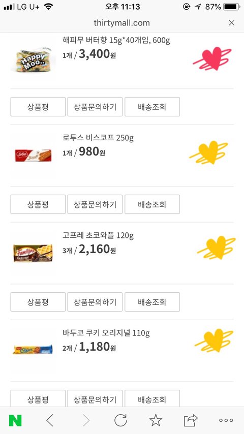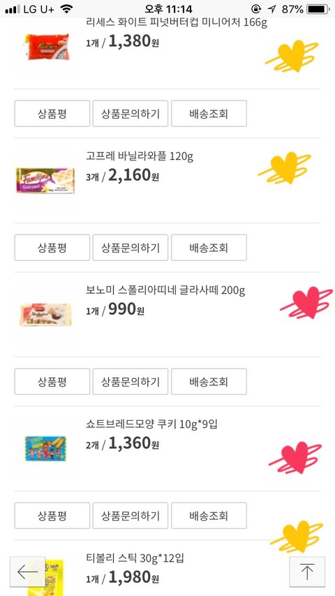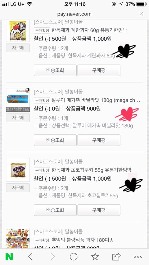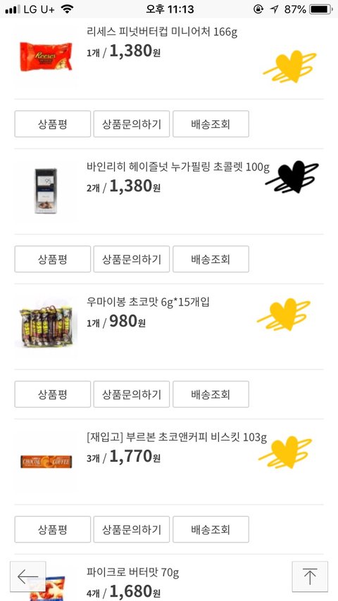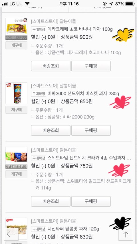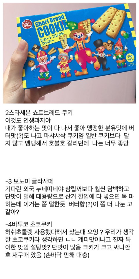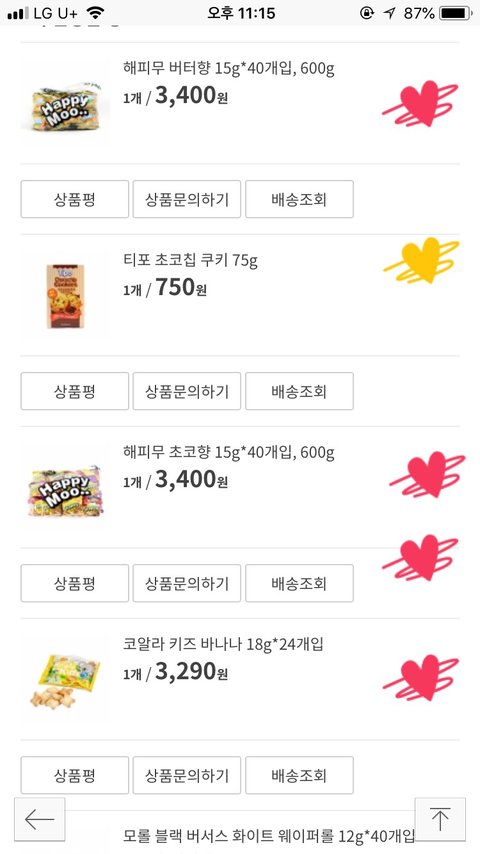 해피무(나는 버터),코알라쿠키(바나나가 젤맛:),모롤웨이퍼,우마이봉(설탕맛(?)좋아함)