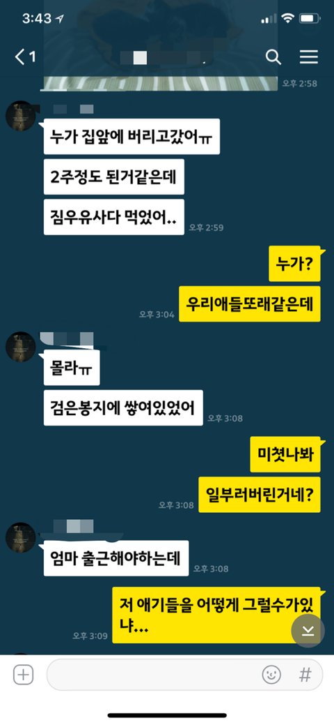 어제 저희어머니께서 출근하려고하시는데 집앞에 검은봉지에 쌓아서 쓰레기더미에 아기고양이 두마리를 버려놓고갔다네요..