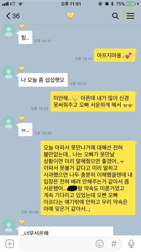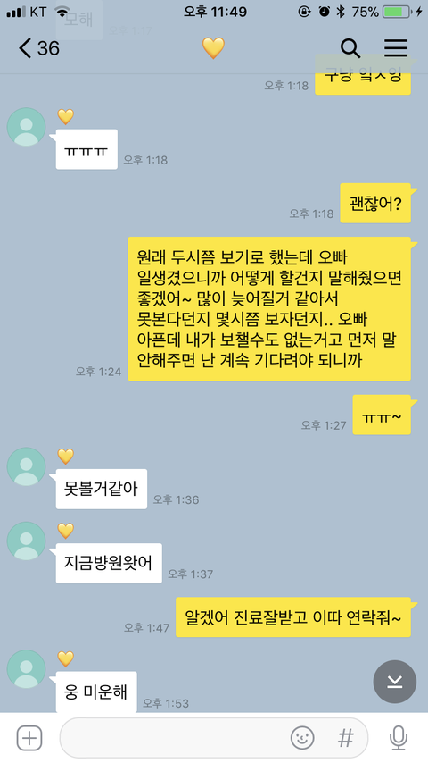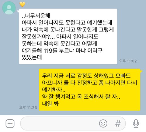 그렇게 계속 톡을 주고 받다가 1시쯤 병원에 가야겠다고 하길래 알겠다고 다시 연락 달라고 했고 30분 정도 있다가 뭐하냐고 연락이 오더라구요