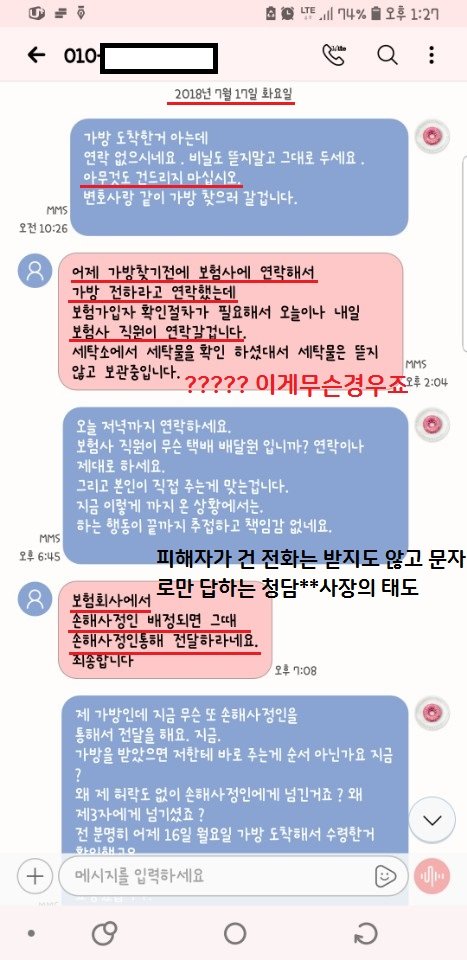 11. (최근)청담** 사장한테 가방달라고 연락함. 전화 다씹힘. 문자왔는데 보험사로 넘겼다함.