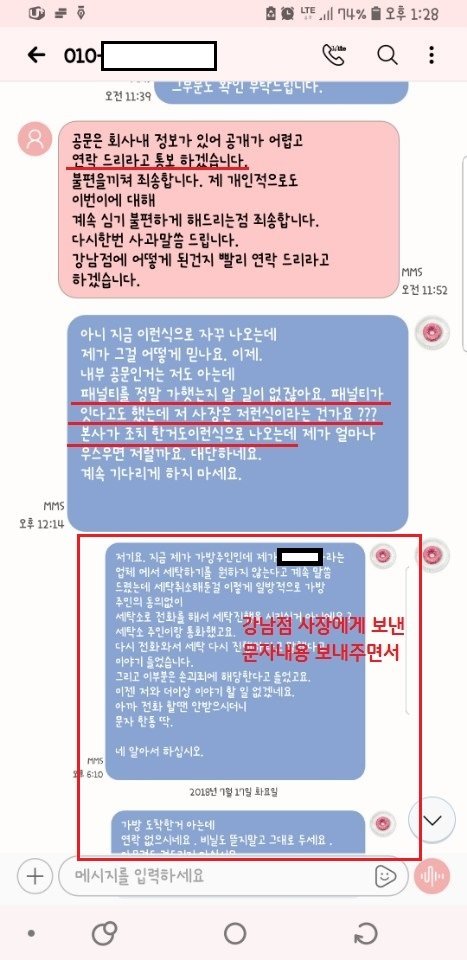 - (세탁이 진행되버리고) 피해자가 강력하게 항의 하여 본사에서 강남점주에게 연락함