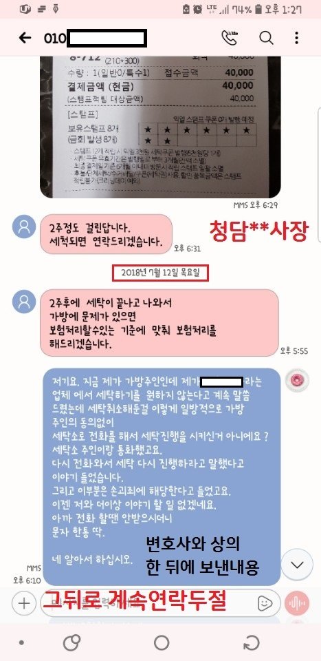 - 저래놓고 뒤에서는 세탁소에 전화해서 피해자가 취소해 놓은 세탁을 강제 진행함
