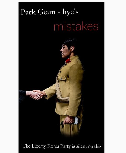 물론 많은 실수를 범하고 지금은 나라의 심판을 받고 있지만, 위안부문제에 있어서는 다시 돌이킬 수 없는 합의가 우리나라의 역사를 더욱 지저분하게 만든 셈이다. 박근혜의 실수에 자유한국당은 당시에도 침묵하고 있었다. 온 세상은 분노했지만 한국당은 조용히 있었다는것이 우리들을 더욱 격분하게 만들었다. 보수적인 사상을 가졌다고 스스로 자부심을 갖고 있다고 매번 생색을 내는 자유한국당인데 참으로 우습게 느껴지는 부분이다. 이 사진에서 한 여성의 손은 박근혜를 묘사했고 일본군제복을 입은 남자는 일본을 상징했으며 남자가 든 국화꽃은 위안부할머니분들을 묘사했다. 이 두사람의 악수는 위안부문제에 합의를 했다는 의미를 묘사했다. 여기서 악수하는 박근혜의 손을 보면 손가락이 가지런하지 않다. 의미는 박근혜의 진지하지 못한 긴장하지 않은 흐트러져 있는 속마음을 묘사했다.