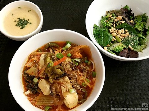 새로운 시도를 주로 하는 "Menus of Change" 키친에서 만들었던 한국식 김치 찌개와 태국식 버섯 수프, 그리고 오리엔탈 드레싱을 곁들인 샐러드.