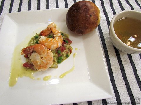 원래 메뉴에는 치킨 콘소메 수프와 샐러드가 사이드 디쉬였는데 무슨 까닭인지 샐러드 대신 새우와 완두콩 리조토가 등장했습니다.