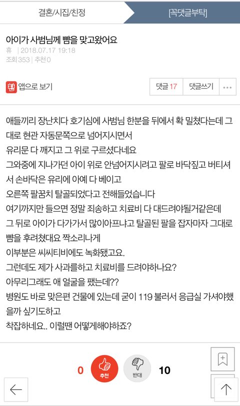 뺨 맞은 거 억울해 미치겠으면 그 부분 보상 받든가 말든가하고 사과하고 치료비 보상에... 다쳐서 일 못하니까 그거까지 보상 다 해줘야지. 미성년자라서 처벌 못하면 애새끼 교육 잘못한 부모라도 처벌해야함. 도대체가 뭔 생각으로 자식새끼 낳아 키우는지 모르겠음. 사람으로 낳아놨으면 사람으로 키워야지. 왜 짐승새끼만도 못하게 키우는지...