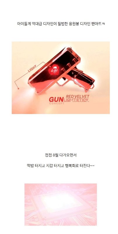인피니트 갓세븐 세븐틴 응원봉 만든 디자이너가 레드벨벳 응원봉도 저렇게 총 모양으로 응원봉 만들거라함. 타팬인데... 진짜 저렇게 나오면 갖고싶음.