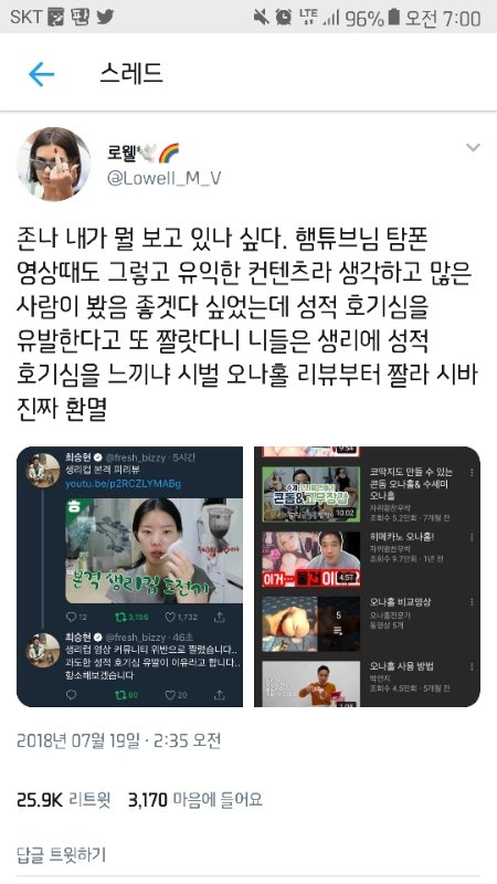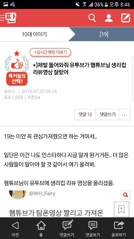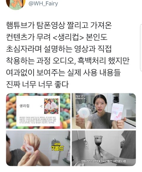 햄튜브님이 유투브에 생리컵 리뷰 영상을 올리셨음.이렇게 어떤 분이 이 영상 잘리기 전에 시청하시고 써주심. 이 사진들 보다시피 아무 문제될 게 없는 그냥 생리컵 영상임. 그리고 햄튜브님이 피 무서워하시는 분들 위해서 저렇게 흑백사진으로 올리심..!