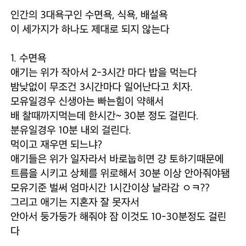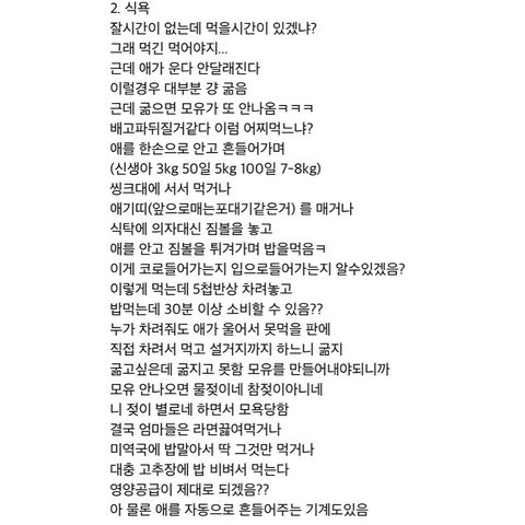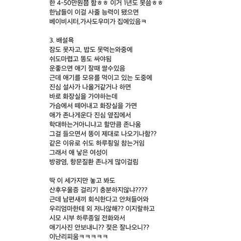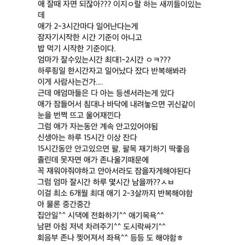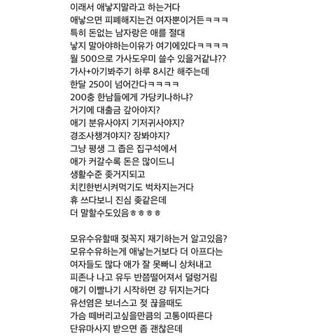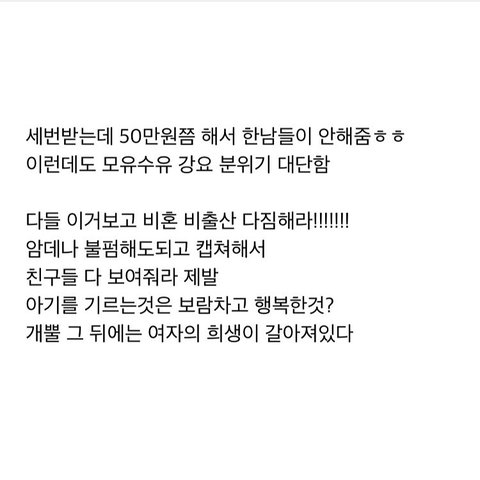 저는 비혼주의도 아니었고 결혼해서 아이 낳고 예쁘게 알콩달콩 살고 싶었는데 이 글을 읽는 순간 그런 생각이 사라지더라구요.. 제 인생은 없고 아이와 남편을 위한 삶이라고 생각되어 결혼과 출산에 대해 조금은 회의적이게 느껴지네요ㅠㅠ