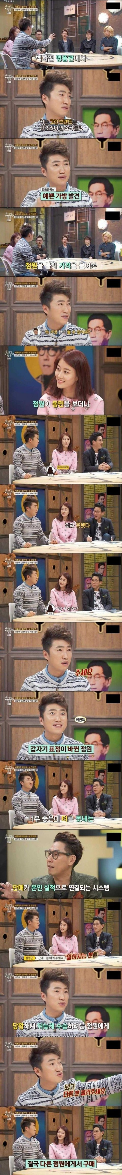 나는 장동민같은 깡?이런게 없어서 저렇게 말도못하고 쭈구리처럼있겠지만 진짜 명품관에서 일한다고 지가 명품인줄 착각하는사람많다...장동민씨 저 일화 진짜 사이다네