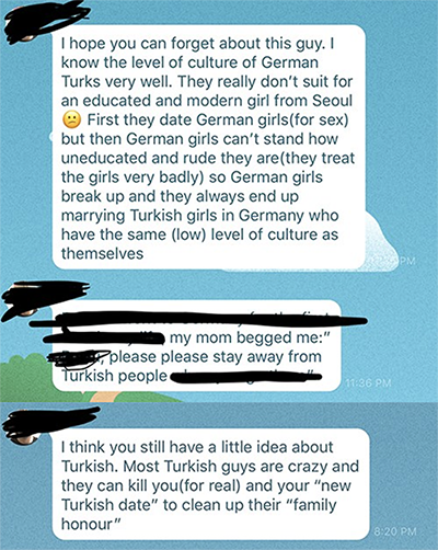 유럽사는 터키 여자들은 시민권, 돈, 승진 등 뭔가 물질적인 것들을 노리려고 접근하는 경우가 많아. 남자들 같은 경우는 주로 성적인 목적으로 접근하거나 아니면 노예처럼 부려먹을 수 있는 신붓감을 찾구. 그래서 동양 여자는 터키남들이 노리는 타겟이야. 동양 여자는 집안일 잘하고 남자랑 남자 부모님한테 순종하는 여자일 거라고 생각하거든. 그 놈도 이런 목적으로 접근한 거였어. 처음에는 간쓸개 다 빼주다가 나중에는 여자는 순종적이어야 된다 , 자기 엄마 모셔야 된다, 자기 일 그만두면 너가 돈 벌어서 서포트 할 수 있냐 이딴 소리를 지껄였어.