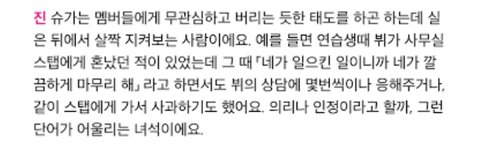 평소 막라랑 놀면서 초딩같은 면모를 많이 보여줘 맏내라는 별명이 있는 석진이도 사실 윤기 못지 않게 현실적이야 은근 이런 드립을 꽤 치지ㅋㅋ