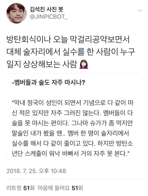 호비 못마심, 태태 맛없어서 안마심, 윤기랑 석진이랑 지민이랑 정국이는 여유되면 마심...결국 아까 지민이가 준 소주 먹던 남준이 아닐까 ㅋㅋ